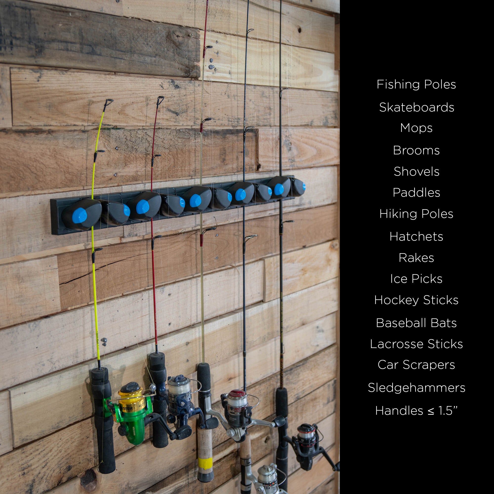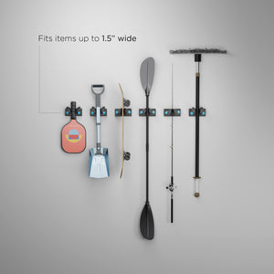 Designed for items with handles up to 1.5 inches in diameter, the Mini is ideal for organizing everything from fishing poles, hiking poles, paddles, skateboards, tools, brooms, mops, rakes, shovels, and more.