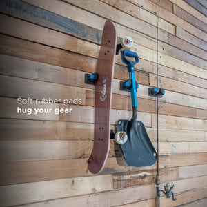 Unlike traditional hooks or pegs, the Gravity Grabber Mini secures gear without pinching, crushing, or deforming. Sports equipment like hockey sticks, baseball bats, and lacrosse sticks stay clean and easy to grab, while heavier tools, hatchets, ice picks, and even sledgehammers stay off the ground and out of the way.